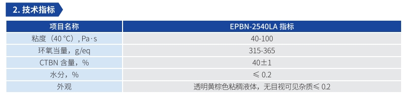 本产品是有液体双酚A环氧树脂与端羧基丁腈液体橡胶的加成物,常温下为液体。用于双酚A体系可明显提高环氧树脂体系的韧性、抗冲击强度和粘着力;也可提高胶粘剂体系的抗剥离、抗冲击、抗剪切性能;还可以明显提高环氧的耐低温剂抗龟裂性能。