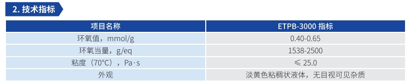 端环氧基聚丁二烯液体橡胶是一种环氧基位于分子主链末端的新型遥爪低聚物。分子链末端的环氧基团较为活泼,容易与多种基团进行反应,因此产品可由酰胺、酸酐、咪唑等非异氰酸酯类固化剂固化;可在室温、中温或高温下固化,尤其适合室温固化。